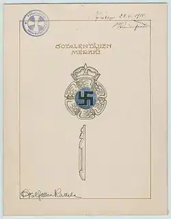 Swedish count Eric von Rosen gave the Finnish White government its second aircraft, a Thulin Typ D.[3] Von Rosen, later one of the founding members of the Nationalsocialistiska Blocket ("National Socialist Bloc"), a Swedish National Socialist political party, and brother-in-law to Hermann Goering,[4][5] had painted his personal good-luck charm on the Thulin Type D aircraft. This logo—a blue swastika, the ancient symbol of the sun and of good luck, which was back then still used with non-political connotations—gave rise to the insignia of the Finnish Air Force. The white circular background originated when the Finns painted over the advertisement from the Thulin air academy.[6] The swastika was officially taken into use after an order by Commander-in-Chief C. G. E. Mannerheim on 18 March 1918. The FAF changed its aircraft insignia, which resembled the swastika of the Third Reich, after 1944 due to an Allied Control Commission decree,[7] which prohibited fascist organizations.[7] It nevertheless continues to feature in some unit emblems, unit flags and decorations, including on uniforms. In 2020, the BBC reported that the FAF had "quietly stopped" using the symbol in the emblem of the Air Force Command.[8]