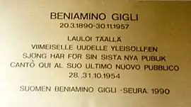Commemorative plaque of Beniamino Gigli's visit to Helsinki on the wall of the Töölö Sports Hall. | |