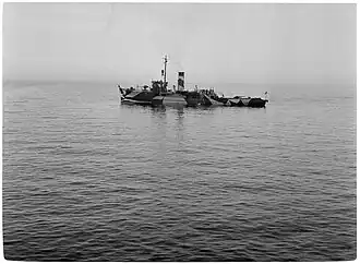 On 2 May 1943 while guarding the mine barriers northeast of Hogland, Turunmaa was seriously damaged in an air raid and the sinking ship had to be beached to shallow water at Haapasaaret (group of islands south from Kotka). Crew casualties were 1 dead and 9 wounded. The ship was immediately refloated and was fully repaired by 23 October 1943.[4][3]