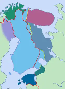 Greater Finland (Finnish: Suur-Suomi; Estonian: Suur-Soome; Swedish: Storfinland) is an irredentist and nationalist idea which aims for the territorial expansion of Finland.[1] It is associated with Pan-Finnicism. The most common concept saw the country as defined by natural borders encompassing the territories inhabited by Finns and Karelians, ranging from the White Sea to Lake Onega and along the Svir River and Neva River—or, more modestly, the Sestra River—to the Gulf of Finland. Some extremist proponents also included the Kola Peninsula, Finnmark, Swedish Meänmaa, Ingria, and Estonia.[2]