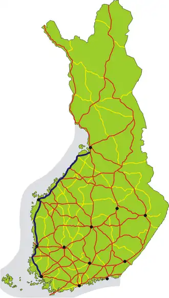 The road goes through the following municipalities: Turku – Raisio – Masku – Nousiainen – Mynämäki – Laitila – Pyhäranta – Rauma – Eurajoki – Luvia – Pori – Merikarvia – Kristinestad – Närpes – Malax – Korsholm (south) – Vaasa – Korsholm (north) – Vörå – Nykarleby – Pedersöre – Kronoby – Kokkola – Kalajoki – Pyhäjoki – Raahe – Siikajoki – Lumijoki – Liminka.