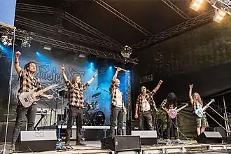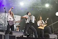 Besides the usual line-up of instruments used in metal (guitar, bass, drums), the band's sound relies heavily on accordion melodies, with the occasional use of instruments such as the tin whistle and the oboe. The band's genre is often dubbed pagan metal because of its use of harsh vocals.