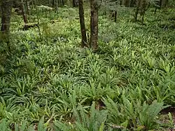 Fiordland National Park contains the majority of the largest area of unmodified vegetation in New Zealand. The dense forests, often clinging to steep valley sides, comprise mostly silver beech and mountain beech, but also podocarps. A large variety of shrubs and ferns, often dominated by crown fern, make up a rich understory of plants, with the forest floor covered in mosses and liverworts.[18] The abundant vegetation is supported by the high rainfall, but continues to be damaged by introduced species such as red deer and possum.[19][20][21]