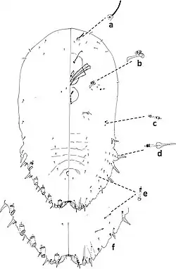 | Fiorinia fioriniae 2nd instar female - a) antenna; b) anterior spiracle c) microduct with sclerotized orifice; d) large gland spine; e) large microduct; f) enlargement of pygidium. | |