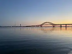 The Fire Island Inlet span cost $10 million to complete and opened to traffic on June 13, 1964.[2][3] By 1985, a dual span was supposed to be built to alleviate traffic; the second bridge proposal was never implemented.[4] As first proposed in 1938, the span was to be a vertical-lift span with a design similar to that of the Marine Parkway–Gil Hodges Memorial Bridge. The design was changed to conform with that of the Great South Bay Bridge, a 600-foot (180 m) steel-arch span with a 60-foot (18 m) clearance.[4]