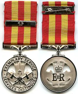 The Fire Services Exemplary Service Medal (French: Médaille de pompiers pour services distingués) is a service medal created in 1985 by the Canadian monarch-in-Council. The medal recognizes members of recognized Canadian fire services who had served for 20 years, ten years of which have been served in the performance of duties involving potential risks. A bar, bearing a maple leaf in silver, is given for each additional 10 years served.[2] The medal is awarded by the Chancellery of Canadian Orders.[3]