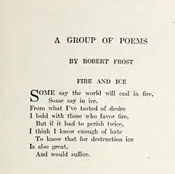 "Fire and Ice" is a short poem by Robert Frost that discusses the end of the world, likening the elemental force of fire with the emotion of desire, and ice with hate. It was first published in December 1920 in Harper's Magazine[1] and was later published in Frost's 1923 Pulitzer Prize-winning book New Hampshire. "Fire and Ice" is one of Frost's best-known and most anthologized poems.[2]