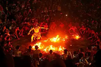Kecak is a form of Balinese Hindu dance and music drama which depicts a battle story from the Hindu epic Ramayana. Kecak is typically performed by about fifty to one hundred men arranged in concentric circles, and whose rhythmic chanting and movement quickens during the performance. Trance rituals often accompany certain sections of the kecak dance, such as during the portrayal of the burning of Hanuman. Here, the dancer playing Hanuman is blessed by a priest and enters a trance state for the 'fire kicking dance' which follows. The dancer does not feel any pain from the fire because he is in a state of trance.[5]
