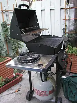 - Barbecue: A device for cooking on a grill over a box containing burning wood, charcoal or, more recently, propane or natural gas.