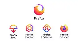 On June 11, 2019, a new logo for the web browser was announced. The 2019 logo was more simple and stylized compared to the previous logos, and was closer in appearance to the first design system presented in 2018,[9] though the system of logos as a whole was closer to the second system.[10] In the 2019 redesign, the globe was changed from blue to purple, and the design of the fox was further simplified, with its legs being removed completely.[11] Additionally, the browser logo aimed to become more abstract in order to make the logo "fit visually with everything else" in the Firefox brand.[3] The brand logo depicts a swirl of fire inspired by the circular motion of the spinning browser icon, as during the development, the team "got a very clear signal that we didn't actually have to show a fox for people to know that it was Firefox".[1][3] Alongside the redesigned browser logo and brand logo, logos were introduced for Firefox Send, Firefox Monitor, and Firefox Lockwise. The logos for Firefox Monitor and Firefox Lockwise were unveiled in May 2019, marking the first of the redesigned Firefox logos to be announced.[12] The new logos for the Firefox brand, the Firefox Browser, Firefox Send, Firefox Monitor, and Firefox Lockwise were implemented in Firefox 70 on October 22, 2019.[13]