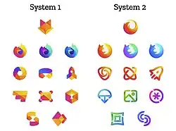 In 2018, Mozilla began an internal design project that aimed to create a new Firefox brand. The project consisted of three teams, each with a separate design theme, being "fire", "fox", and "free".[1][3] That July, Mozilla revealed proposals to create a new series of logos for Firefox, saying that "as an icon, that fast fox with a flaming tail doesn't offer enough design tools to represent this entire product family",[6] and that they intended to design the family of logos with a blank slate, rather than tweaking previous designs.[7] The proposals consisted of two "design systems", each with both a series of logos for individual Firefox products, and a singular logo to represent the brand as a whole. The brand logo in the first design system was a stylized, geometric fox head, while the brand logo in the second design system was a simplistic, circular flame.[8]