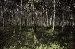 Firestone utilized controlled burns during the dry season and manual clearing with axes and saws during the rainy season to clear extensive areas of land for rubber cultivation.[37] By early 1929, Firestone had cleared over 15,000 acres of land.[38] They replaced native trees, including those with medicinal or ritualistic value such as the sasswood, red ironwood, and Cassipourea firestoneana trees, with meticulously arranged rows of rubber trees.[39] Tapping operations commenced shortly thereafter, and by 1940, Firestone had achieved a production of over 7,000 tons of latex per year.[40]