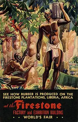 In Journey Without Maps, Graham Greene's 1936 chronicle of his four month journey in Liberia, Greene describes Firestone as: "a commercial company with no interests in Liberia but rubber and dividends," adding that, "no one could really tell whether that labour was voluntary or forced."[17] Greene also highlights the Firestone plantation hierarchy: "at the end of several hours’ rough driving from the capital, live the Firestone men in houses containing shower baths and running water and electric light, with a wireless station, tennis courts and a bathing pool, and a new neat hospital in the middle of plantations which smell all the day through of latex, as it drips into little cups tied beneath incisions in the trunks. They, more than the English or the French, are the official Enemy, and no story of whipping post, smuggled arms or burnt villages is too wild to be circulated and believed among Liberians of both parties."[17]