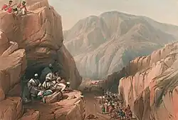 While trying to cross the Koord-Kabual pass in the Hindu Kush that was described as five miles long and "so narrow and so shut in on either side that the wintry sun rarely penetrates its gloomy recesses", the Anglo-Indian force was ambushed by the Ghilzai tribesmen.[74] Johnson described "murderous fire" that forced the British to abandon all baggage while camp followers regardless of sex and age were cut down with swords.[75] Lady Sale wrote: "Bullets kept whizzing by us" while some of the artillerymen smashed open the regimental store of brandy to get drunk amid the Afghan attacks.[74] Lady Sale wrote she drank a tumbler of sherry "which at any other time would have made me very unlady-like, but now merely warmed me."[74] Lady Sale took a bullet in her wrist while she had to watch as her son-in-law Sturt had "...his horse was shot out from him and before he could rise from the ground he received a severe wound in the abdomen".[74] With his wife and mother-in-law by his side in the snow, Sturt bled to death over the course of the night.[74] The incompetent, naive and gullible Elphinstone continued to believe that Akbar Khan was his "ally", and believed his promise that he would send out the captured supplies if he stopped the retreat on 8 January.[76] Adding to the misery of the British, that night a ferocious blizzard blew in, causing hundreds to freeze to death.[77]