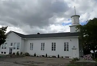 The First Baptist Church of Grand Blanc is a rectangular plan gable end structure, three bays wide. The front facade has a central double door entrance flanked with pilasters. and topped by a full entablature. On either side are stained glass windows; more windows line the side facades. The church is topped with an octagonal belfry.[3]