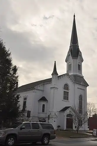 The church building, the second for the congregation, was constructed in 1838, and originally had Greek Revival styling. In 1874 it was significantly renovated, and given its present Gothic Revival appearance.[2] The building was listed on the National Register of Historic Places in 2003.[1]