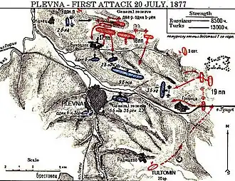 The first battle of Plevna (or "defence of Plevna", a made-up title by the author Frederick William von Herbert[4]) was the first assault that happened during the siege of Plevna in July 1877. On July 18th, 1877, 1,500 Russian cavalries were reconnoitering around the town of Plevna in Ottoman Empire. They, the Russian cavalries, did clashed when the Turkish skirmishes were small, and the Russians think that the town itself was minorly defended. They report this to the lieutenant general Schilder-Schuldner. He sends his whole infantry estimated 7,500 to occupy the town of Plevna, which take place on July 20th 1877.[2]