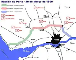 In the First Battle of Porto (29 March 1809) the French under Marshal Soult defeated the Portuguese, under General Parreiras, outside the city of Porto[a] during the Peninsular War. Soult followed up his success by storming the city,[3] in the course of which thousands of fleeing citizens drowned in the Porto Boat Bridge disaster.