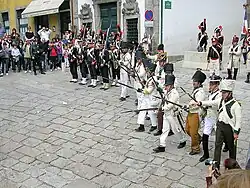 ![]() Marshall Soult surveys the broken bridge as Oporto falls to the French on 29 March 1809. In the foreground a grenadier rescues an orphaned baby. | |||||||