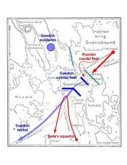 Several factors contributed to the Swedish defeat. A successful Russian blockade at Porkkala prevented two archipelago frigates, roughly twenty galleys, and several gun sloops and yawls from reaching Svensksund in August 1789.[6] Ehrensvärd's preparations for defense were hampered by King Gustav III's opposition to his plan. Ehrensvärd's decision not to blockade the narrow between Tiutine and Koiromsari due to his belief that it was too shallow to navigate was a crucial error; and delayed construction of obstacles in the straits opening towards Frederikshamn made it possible for the Russians to clear them quickly. Inadequate sounding of the Swede's selected battleground caused several Swedish ships to run aground during the battle. The Swedes might have been victorious at Svensksund in 1789 had the king allowed Ehrensvärd to withdraw to Svartholm after defeating Balle's squadron as Ehrensvärd had planned. King Gustav III was aware his fleet was running low on ammunition when he gave the order to fight against the main force of the Russian coastal fleet.[7]