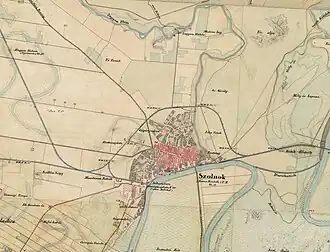 Meanwhile, the National Defence Commission (OHB), which, starting from October 1848 was acting as a Hungarian government, was shocked to learn that Perczel had abandoned the Tisza line.[3] Its president, Lajos Kossuth was not happy to see that the bridge over the Tisza at Szolnok was in the hands of the enemy, who had the opportunity to advance towards Debrecen or Szeged, to threaten the seat of government, or to lend a hand to the Serbs rebels from the southern front.[5] On 15 January, both Perczel and Répásy received an order from the OHB demanding the two corps to stop the retreat and take offensive action.[8] By a strange twist of fate, Szolnok was defended against Perczel on 22 January by the same Ottinger cavalry brigade that had so badly beaten him at Mór. Now the Hungarian general had the chance to avenge his earlier fiasco against Ottinger.[3] On 18 January, Perczel reported to the OHB that he was leaving for Szolnok the next day.[8] After leaving a few thousand men under the command of Lajos Asbóth to guard the bridge at Tiszafüred, it set off for Szolnok.[9] In December 1848, Kossuth began to organize a reserve corps under the leadership of General Mihály Répásy, which had many untrained and unequipped units, but he put the more capable ones at Perczel's disposal.[3] Répásy sent Perczel substantial reinforcements, which rose his troops to more than 16,000 men and 52 guns.[8] On 16 January, Perczel's troops presented the following composition. At Karcag, 5 battalions, 8 companies of cavalry, 1 twelve, 1 six-pounder, and a 1/2 cavalry battery; at Nádudvar, 4 battalions and a six-pounder battery. In Tiszaújváros, 4 battalions, 6 cavalry companies, 1 six-pounder, and 1/2 cavalry battery; in all, 13 battalions, 14 companies of cavalry, and 40 cannons, about 15,000 men, and 2,000 horses. In its organization, the corps was divided into three divisions of 2-2 brigades under Mihály Répássy, János Hertelendy and István Szekulics. The two brigades of Hertelendy, were led by Majors Károly Mihály and Ignác Mándy; those of Szekulics by Majors Luigi Venturini and Alexander Buttler; and the two brigades of Répássy by Lieutenant Colonel Lajos Kazinczy[5] and Major Károly Albrich.[1] On the 21st, Perczel and the bulk of his army entered Törökszentmiklós, while Kazinczy's division was detached to Tiszabő.[9]