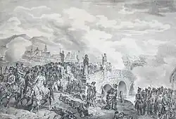 Wysocki's division charged three times the stone bridge, but their repeated attacks crumbled under the fire of the 12. imperial kaiserjägers.[22] The rout of the Polish Legion caused also the other battalions, which were following them, to retreat.[10] After its failure, the 3rd (called the "White Feathered Battalion") battalion, led by the hero of several battles, lieutenant colonel Károly Földváry, came up from the 7 Chapes hill to attack the bridge, but they were pushed back by the retreat of the Polish Legion.[21] The Austrian 3/LXIIII battalion, noticing this confusion among the enemy troops, started a counter-attack, occupying the bridge.[20]