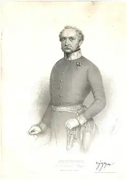 Then came to the scene the commander of the 3rd battalion, Major Károly Földváry, the hero of the Battle of Tápióbicske, with the banner of his battalion in his hand. He went to the standard-bearer of the Polish Legion, and wanted to take the flag of them in his hand, wanting to lead both the 3. battalion and the Polish soldiers to attack against the Austrians, but the standard-bearer resisted, saying: Wont attack, let the Hungarians go to attack.[23] The Polish standard bearer was probably afraid that he will be executed if he lets the flag of his unit to be taken by somebody from another unit, as it happened to the standard-bearer of the 9. battalion when the same Földváry took their flag in his hand in the battle of Tápióbicske.[24] Földváry then went to Knezić's division's 9. battalion, called the "Red Hatted" battalion, which together with his 3. "white feathered" battalion, were regarded as the bravest battalions of Damjanich's III. corps, and led them to attack against the bridge.[23] Here fierce hand-to-hand combat ensued with the Austrian 3/LXIIII battalion, as the result of which the Austrians were pushed back, the Hungarians taking half of the bridge.[23] Then Földváry took the flag of his battalion and rode onto the bridge with it, followed by the 3. and 9. battalions, under a hail of bullets from the 3/LXIIII battalion and the 12. kaiserjäger battalion. Földváry's horse was shot dead in seconds, as a result of which the Hungarian battalions stopped, fearing that their leader was killed, but he went back to his soldiers, took another horse and rode up the bridge again, and the same thing happened: the second horse fell down beneath him in a second, but he remained unharmed.