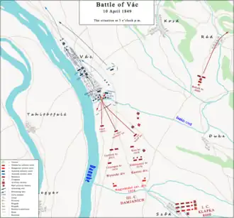 After the Battle of Isaszeg, Field Marshal Windisch-Grätz ordered the division quartered in Balassagyarmat to defend the Ipoly valley, led by Lieutenant General Georg von Ramberg, to move to Vác, to secure the Danube Bend from a Hungarian attack. But at the same time he made the mistake of ordering Lieutenant General Anton Csorich, who actually was defending Vác with his division, to move to Pest.[2] If two imperial divisions had been defending Vác when the Hungarians attacked, they would have had more chance of repelling them. On 10 April, when the Hungarian army planned to attack Vác, Görgey feared an imperial attack against his troops in the region before Pest. And indeed Windisch-Grätz ordered a general advance of his I and III Corps, to learn whether the Hungarian main army was in front of Pest or had moved northwards. But the Hungarian II Corps led by General Aulich, together with VII Corps and much of I Corps, easily repelled the attack.[6] At the same time, the deceptive maneuvers by Aulich and Asbóth managed to attract the attention of the imperials, who did not notice the march of III Corps, led by János Damjanich.[7] As a result, the field marshal was unable to obtain the information he needed. The inefficiency of the imperial reconnaissance is shown by the fact that on 12 and 14 April (4 days after the battle of Vác, when the main Hungarian army had already departed towards Komárom, and only II Corps remained there), Anton Csorich reported that Pest was in danger of being attacked by substantial Hungarian forces.[6] Aulich and Asbóth's troops did their job of making the imperials believe that the main Hungarian army was still in front of the capital so well that neither Windisch-Grätz until his dismissal, nor Lieutenant Field Marshal Josip Jelačić (interim commander until the arrival of Feldzeugmeister Ludwig von Welden who was named as the new commander-in-chief), dared to do anything.[8] In contrast, the Hungarian reconnaissance was excellent, learning that Windisch-Grätz was still before Pest with three army corps awaiting the Hungarian attack, and that Ramberg's division, composed of the Götz and Jablonowski brigades, was at Vác blocking the road to the Danube valley and to the Vág river.[9]