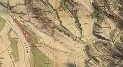 On a rainy 10 April, Damjanich positioned his troops south from Vác around 9 o'clock, after moving along the Pest-Vác road, because on that morning the fields were impassable due to wet weather.[16] The Hungarian general positioned his troops as it follows: the Wysocki division (with the Czillich brigade in the first and the Leiningen brigade in the second line) deployed along the Dunakeszi-Vác road having the Danube on their left side, the division led by Colonel Károly Knezić (with the Kiss brigade in the first and the Kökényessy brigade in the second line) formed the right wing, along the railroad, while the cavalry division led by General József Nagysándor remained as the third line. Damjanich deployed the whole artillery of his III. corps on the sand dunes near the railroad.[17] At 9.30 a.m. lieutenant colonel Althann the leader of the Austrian wanguard reported to Götz the approaching of enemy troops from South, so the Austrian commander, together with General Felix Jablonowski, the commander of his second brigade, rode to the Austrian outposts.[17] The road which led to Vác from South crossed the stone bridge (called also the bridge with statues, because of the statues on them, representing 7 saints) over the Gombás creek, while East from the town was another bridge for the Vác-Pest railway. Götz positioned the soldiers of the 15. Infantry Regiment from to the Jablonowski brigade in front of the entrance of the town as it follows. Near the Danube's shore on the Gallows hill (Akasztófadomb) placed the 3. battalion, on the Seven Chapels hill (Hétkápolna domb) the 2. battalion, while on the railway bridge the 1. battalion.[18] He sent the 12. kaiserjäger battalion to guard the graveyards in front of the stone bridge.[17]