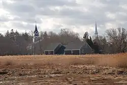 First Church UCC (or "First Church," or "First Church Sandwich," or "First Church of Christ") is a Congregational church in Sandwich, Massachusetts founded in 1638 under Plymouth Colony Charter and the Mayflower Compact.[1] It is either the oldest church on Cape Cod or the second oldest depending on the interpretation. First Church boasts Mayflower Pilgrims and their first-generation descendants as charter members.[2] By Plymouth Colony Charter, a church was required as an official part of the governance of any newly founded township, and First Church was founded as the official church within the town of Sandwich.[3] First Church is now a congregation of the United Church of Christ, a large theologically and socially liberal denomination. The church is open and affirming – an appellation signifying both openness to and active affirmation of all persons regardless of status (and including LGBTQI persons). First Church is well known to tourists because of the inclusion of its current steeple on the cover of Elvis Presley's How Great Thou Art gospel album.