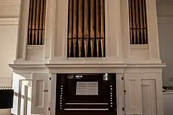 First Church's 1847 G compass parlor-type organ was installed in 1861. It sits in the choir loft at the rear of the sanctuary, with the organist's position facing away from the sanctuary.
