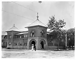 The church was founded in 1888. The current church building, designed in the Italian Romanesque style, was completed in 1914 at a total cost of $210,000.[2] Jotham Bixby Sr., known as the "Father of Long Beach", was the largest contributor to the construction fund, having given $25,000.[2] The building was designed in the Romanesque style by architect H.M. Patterson of Los Angeles and built of red pressed brick laid in patterns and trimmed with white terra cotta.[3] The large auditorium had the capacity for seating 1,500 persons.[3] The Los Angeles Times wrote that the "immense auditorium, the roof of which is fifty-five feet above the floor, gives one the impression he is entering one of the cathedrals of Europe."[3] The Times also referred to the church's art-glass windows as being "among the finest to be seen in the West."[3] The church also featured three great rose windows above the gallery and six picture windows below the gallery. The center window was called the "Light of the World."[3]
