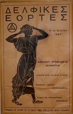 The 1927 First Delphic Festival was held on May 9 and 10, 1927 at the initiative of Angelos and Eva Sikelianos, and consisted of a series of events in the archaeological site of Delphi.[1] The Delphic Festival was inspired by the ideals adopted by Sikelianos and Eva Palmer, focusing on the solidarity of people all over the world and of mutual respect. The Sikelianos couple believed that Delphi could actually serve as a focal point for this global understanding, due to the Amphictyony which had been established there for centuries. They built a house in the region and prepared the celebrations which were about to have an international calibre. The entire endeavor was funded by the Sikelianos couple and was repeated two times (1927 and 1930), a fact which exhausted them financially and soon led them to separation.