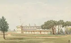 At the back of the house were clusters of outbuildings containing the kitchen, bakehouse, stables and offices and workrooms. In 1794, Lieutenant Governor Grose added a verandah to the house, which was later extended in 1802 by Governor King .[4] In 1795, Governor Hunter set up the colony's first printing office in the grounds which produced Notices and Orders, and in 1803, Australia's first newspaper, the Sydney Gazette.[1][2]