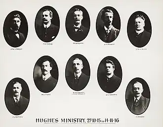 The First Hughes ministry (Labor) was the 11th ministry of the Government of Australia. It was led by the country's 7th Prime Minister, Billy Hughes. The First Hughes ministry succeeded the Third Fisher ministry, which dissolved on 27 October 1915 following Andrew Fisher's retirement from Parliament to become the next High Commissioner to the United Kingdom. The ministry was replaced by the Second Hughes ministry on 14 November 1916 following the split that took place within Labor over the issue of conscription. This led to Hughes and his supporters leaving the party to form the National Labor Party.[1]