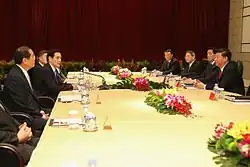 After the meeting, representative of the People's Republic of China, Taiwan Affairs Office Director Zhang Zhijun, conveyed words from Xi that the meeting was a new page in history for cross-strait relations. He reiterated Xi's four points to Ma, which are adhering to the 1992 Consensus, developing cross-strait peace, expanding the effects of the prosperity to more public segments and cooperatively pursuing the Chinese renaissance.[29] Zhang added that Xi agreed to establish the cross-strait hotline that can help both sides communicate with each other, avoid miscalculation and also to deal during emergencies and important matters.[30] Taiwan's participation in the Asian Infrastructure Investment Bank was also encouraged. Xi told Ma that both sides are one family, emphasizing the same cultural and blood lineages of both sides of the Taiwan Strait and the improved relations over the past seven years. Ma told Xi that both sides should respect each other's value and way of life, and stating his five remarks, which are consolidating the 1992 Consensus, downgrading tension by solving problems peacefully and establishing cooperative efforts to revitalize the Chinese nation.[23][31][32]