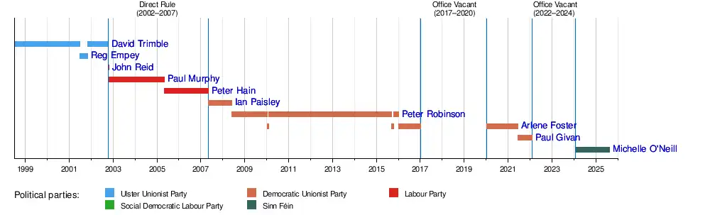 Paisley stated his intention to resign on 4 March 2008.[29] His Deputy as DUP leader, Peter Robinson was ratified as Democratic Unionist Party leader designate on 17 April 2008[30] and became First Minister on 5 June 2008. Arlene Foster succeeded Peter Robinson as DUP leader on 18 December 2015, and as First Minister on 11 January 2016.[31]