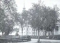 The first church building was a crude log cabin thatched with grass.[1] Beyond the church, the Puritans founded the first elementary school supported by public money in the American colonies. They held the first Town Meeting at the church, also called a Meetinghouse, which determined policy through open and frequent discussion. The congregation's fifth building burned in February 1896, and the current building was completed in 1897.[2]