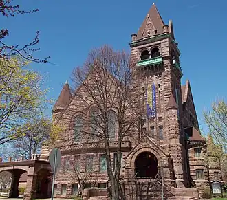 The congregation built another church building in 1853 on Third Street between Harrison and Main Streets. In 1864 they sold that property and purchased the former St. Luke's Episcopal Church on Brady Street. This building served the congregation for over thirty years when the decision was made to build a new church closer to the center of the parish. The ground was broken for the new church at the corner of Kirkwood Boulevard and Iowa Street on March 18, 1898. The church's cornerstone was laid the same year on July 20, and the new church was dedicated on December 17, 1899.[3] The old church became the Academy of Sciences, a forerunner of the Putnam Museum