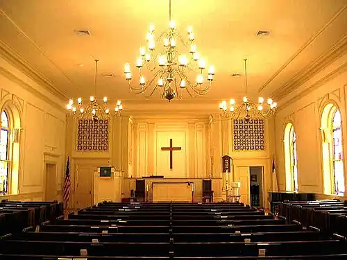 In 1905, the first pipe organ, an Estey Organ, was purchased and subsequently installed.[5] In 1924, the organ was improved by the M. P. Möller Company of Hagerstown, Maryland. The instrument was two manuals and pedal, of 20 ranks. This instrument was destroyed by a fire in 1928 that gutted the interior of the sanctuary. The congregation quickly rebuilt, replacing the organ with essentially the same instrument. In 1945, a three rank antiphonal division was installed in the balcony.