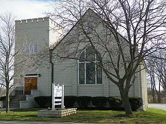 First Presbyterian Church of Ontario Center is a historic Presbyterian church located at Ontario Center in Wayne County, New York. It was built in 1914 and is a Tudor Revival style concrete block church cast to resemble rusticated masonry. It is roughly square in plan and topped by a cross gable roof. The front facade features a massive square corner tower capped with a crenelated parapet.[2]