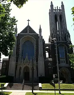 The Church was designed in a Gothic Revival style by the architecture firm of Corbusier and Foster in Cleveland, Ohio. The base of the exterior walls of the church, as well as the trim are limestone. The floor tiles were designed and made by Henry Chapman Mercer of the Moravian Pottery and Tile Works in Doylestown, Pennsylvania.[3] The church and adjacent school building have stained glass windows by Connick Studios of Boston, D'Ascenzo Studios of Philadelphia, and Tiffany Studios of New York.[4] The church's organ was built by Skinner Organ Company.[5]