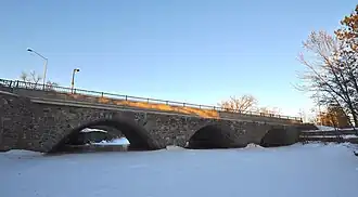 The First Street Bridge is a stone arch bridge in Merrill, Wisconsin, which carries First Street across the Prairie River. The bridge is 130 feet (40 m) long and has three arches. Each arch is bordered by an alternating pattern of single and double stones and is capped by 30-inch (760 mm) keystones.[2] Contractor Fred Hesterman built the bridge in 1904, replacing an existing bridge. The bridge is the only known three stone arch bridge in Wisconsin.[3]