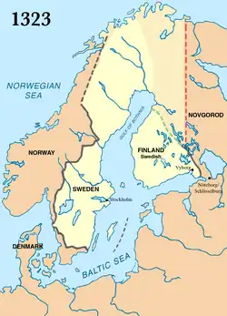 The Treaty of Nöteborg was signed after the Kexholm war on 12 August 1323. Signed in Orshek (Swedishː Nöteborg), it was the first settlement between Sweden and The Novgorod Republic regulating their border which stretched into the area known as today's Finland. The purpose was "permanent peace" between Sweden and Novgorod but it did not last very long.