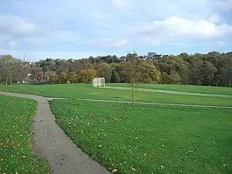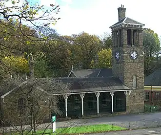 The lodge has a striking clock tower which in its early days stood at the main entrance to the park at the then farthest extent of Firth Park Road. The lodge incorporated a park keeper's house and refreshment rooms. In June 1973 the building was designated a Grade II listed building,[2] and today it provides community facilities, having been refurbished after an arson attack in 1995. In 1949 the main entrance to the park was moved onto Hucklow Road near the main shopping area of the newly established suburb of Firth Park. Formal gardens were also laid out at this time, and in the 1970s a children's playground was constructed.[3]