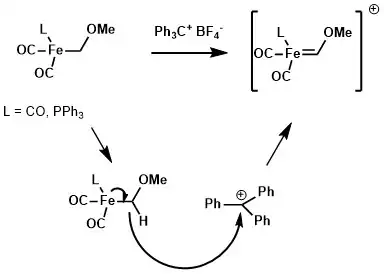 With a suitable hydride abstracting reagent, such as the trityl cation, the hydride on alkyl ligand of a metal complex could be abstracted to form a Fischer carbene.[6]
