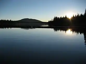 Fish Lake was originally a small natural lake.[5][6] In 1898, the Fish Lake Water Company was established to help irrigate the Rogue Valley. The company proposed to enlarge Fish Lake and nearby Fourmile Lake for added water storage. The temporary Fish Lake Dam was constructed between 1902 and 1908. In 1906, Fourmile Lake Dam was constructed. The two lakes were connected in 1915 by the Cascade Canal, bringing water from Fourmile Lake in the Klamath River watershed over the Cascade Divide to Fish Lake, to supplement Little Butte Creek. The temporary dam was replaced by a permanent earthfill dam.[7] The dam was modified again in 1922.[8] In 1955, a new spillway was constructed. An auxiliary spillway was added in 1996.[3] The lake is now about three times its original size.[5]