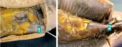As with other vertebrates, the intestines of fish consist of two segments, the small intestine and the large intestine. In most higher vertebrates, the small intestine is further divided into the duodenum and other parts. In fish, the divisions of the small intestine are not as clear, and the terms anterior intestine or proximal intestine may be used instead of duodenum.[31] In bony fish, the intestine is relatively short, typically around one and a half times the length of the fish's body. It commonly has a number of pyloric caeca, small pouch-like structures along its length that help to increase the overall surface area of the organ for digesting food. There is no ileocaecal valve in teleosts, with the boundary between the small intestine and the rectum being marked only by the end of the digestive epithelium.[24] There is no small intestine as such in non-teleost fish, such as sharks, sturgeons, and lungfish. Instead, the digestive part of the gut forms a spiral intestine, connecting the stomach to the rectum. In this type of gut, the intestine itself is relatively straight, but has a long fold running along the inner surface in a spiral fashion, sometimes for dozens of turns. This fold creates a valve-like structure that greatly increases both the surface area and the effective length of the intestine. The lining of the spiral intestine is similar to that of the small intestine in teleosts and non-mammalian tetrapods.[24] In lampreys, the spiral valve is extremely small, possibly because their diet requires little digestion. Hagfish have no spiral valve at all, with digestion occurring for almost the entire length of the intestine, which is not subdivided into different regions.[24]