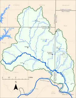 Downstream of Mosby, it collects the East Fork Fishing River, which rises at the town of Lawson and flows 20.6 miles (33.2 km)[1] generally southward through Ray and Clay counties, through the resort community of Crystal Lake and past the town of Excelsior Springs.[2]