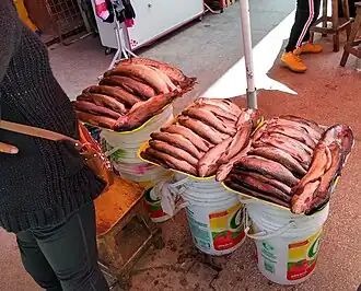 In 2008, exported canned fish products amounted to about US$89 million, with a volume of about 39,100 tonnes, or about 3 million cans. In 2008, exported frozen fish products amounted to about US$463 million, with a volume of over 328,000 tonnes. The main export markets for frozen products were China (19%), United States (17.2%), Spain (16.1%), France (7.9%), South Korea (7.1%), Italy (4%), and Japan (3.5%).[12] In 2023, about 686,000 tonnes of frozen product were produced, and frozen product exports amounted to about US$1.56 billion; about 160,000 tonnes of canned fish products were produced, and canned fish product exports amounted to about US$58 million.[57]